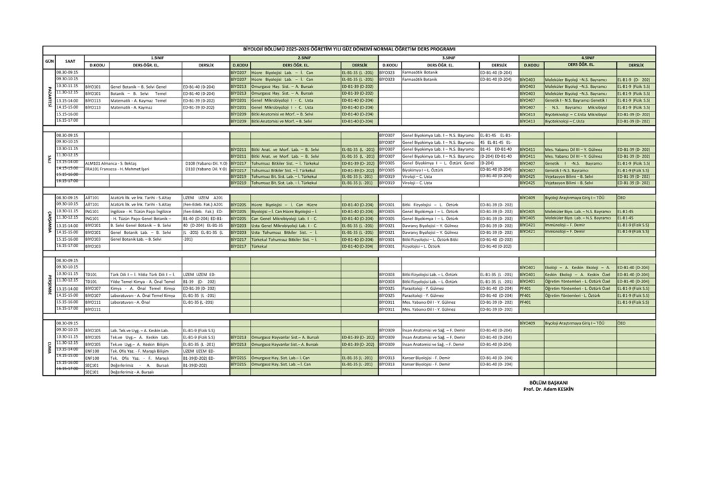 Biyoloji Bölümü haftalık ders programı yayınlanmıştır. Öğrencilerimize ve Öğretim üyelerimize başarılı bir ders dönemi dileriz.